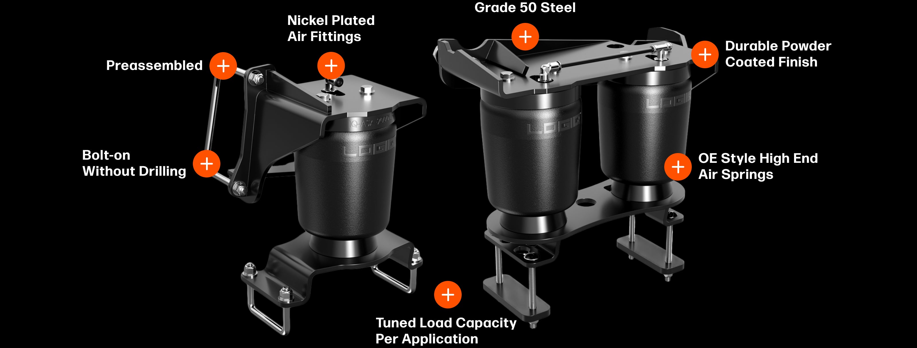 LOGIQ air springs are designed for more travel than traditional double bellow helper bags, maximizing suspension droop and your trucks ability on and off the road.